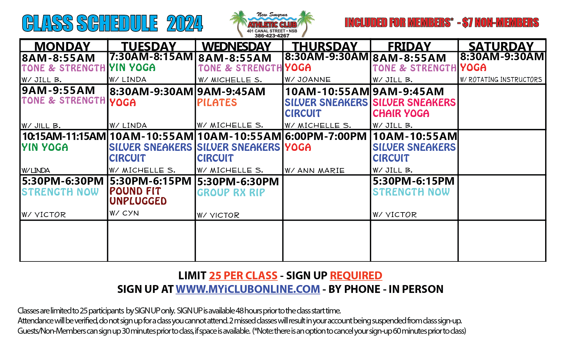 For those that attend our classes, this is a very important reminder that during the winter months classes fill up, and they fill up fast. Members are able to sign up for class 48 hours ahead of time by going to MyiClubOnline.com - if a class is full there is an option to be put on the Waitlist which will automatically NOTIFY you if there is a spot that has opened up. You are still responsible to enroll in that open space, even if you are on the waitlist. All spots are available on a first come first serve basis. We cannot guarantee you a space in a class if you attempt to walk in on the day of class, especially during the busy time of year. Calling and leaving a voicemail to be signed up for class also does not guarantee a place in that class, as our voicemail is checked during business hours and all spaces in those classes could have been taken by members signing up online. Non-members and/or guests have to inquire no sooner than 30 minutes before a class is to start if there are any spaces available.